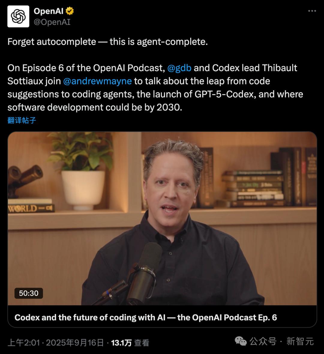 在OpenAI播客第六集中,总裁Greg与Codex负责人Thibault Sottiaux聊了很多关于GPT-5-Codex,以及到2030年软件开发可能会是「什么样子」。