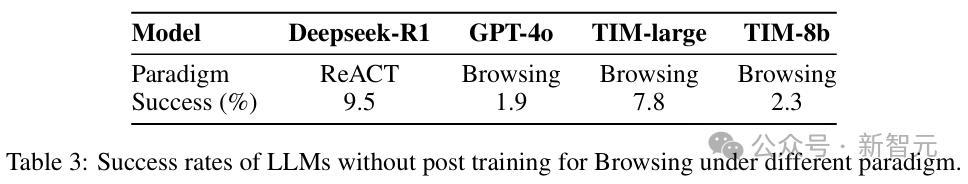 在没有任何智能体设计的情况下,TIM-8b的表现便已经优于具备浏览功能的GPT-4o,而Tim-large更是取得了与构建在Deepseek R1上的ReACT智能体相媲美的性能。
