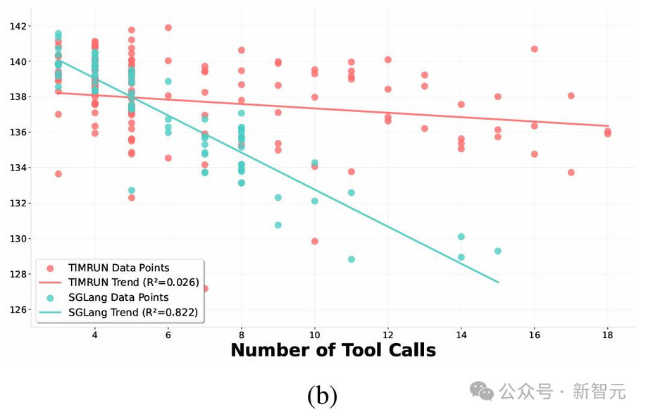 相比之下,得益于自动化的上下文管理机制,即便工具使用规模扩大,TIMRUN仍能保持相对稳定的吞吐量。