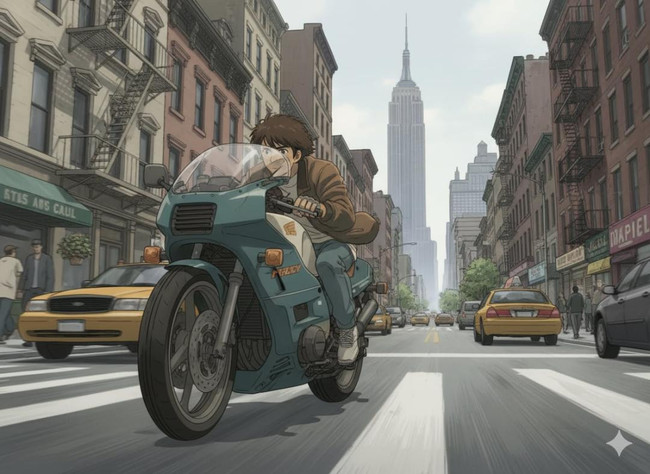 第二步轮到 Nano Banana,生成同一个动漫人物骑摩托穿过街道的场景。