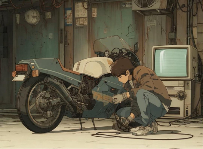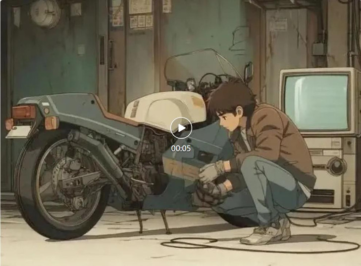 第一步:下面这张原始图像定义了动画中的角色、风格和环境,我们将它上传至豆包或即梦,输入提示词:Man fixes his motorcycle.[Cut] Man fits a missing part onto the side of the motorcycle.[Cut] Close-up shot: the man"s face satisfied as he is looking at the motorcycle.(男人修理他的摩托车。[跳切] 男人将一个缺失的部件装上摩托车。 [跳切] 特写镜头:男人看着摩托车,脸上露出满意的表情。)