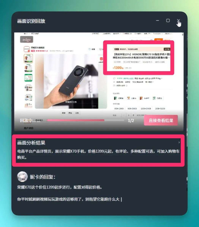 接着,当我点进某款手机(荣耀 X70)的详情页时,干扰因素减少了很多,逗逗 AI 的识别效果好了很多。机型、价格等关键信息都能准确捕捉。
