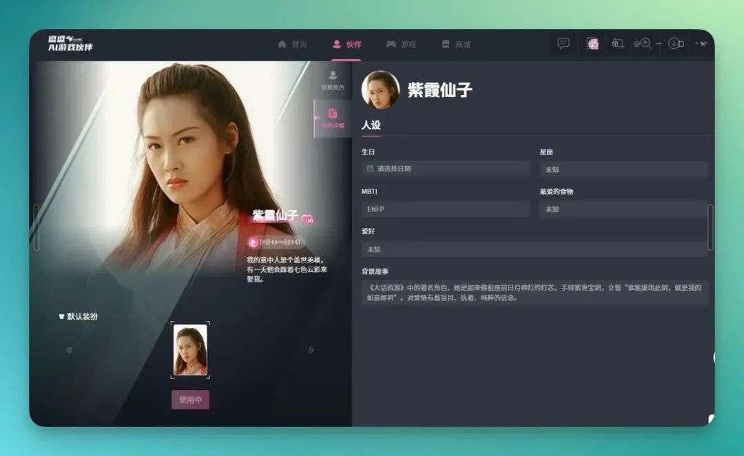 然后,我们换个「AI 伙伴」,试试紫霞仙子。这个角色肯定是很多人的「青春物语」,在逗逗 AI 里,朱茵老师的声音还原得挺真实的: