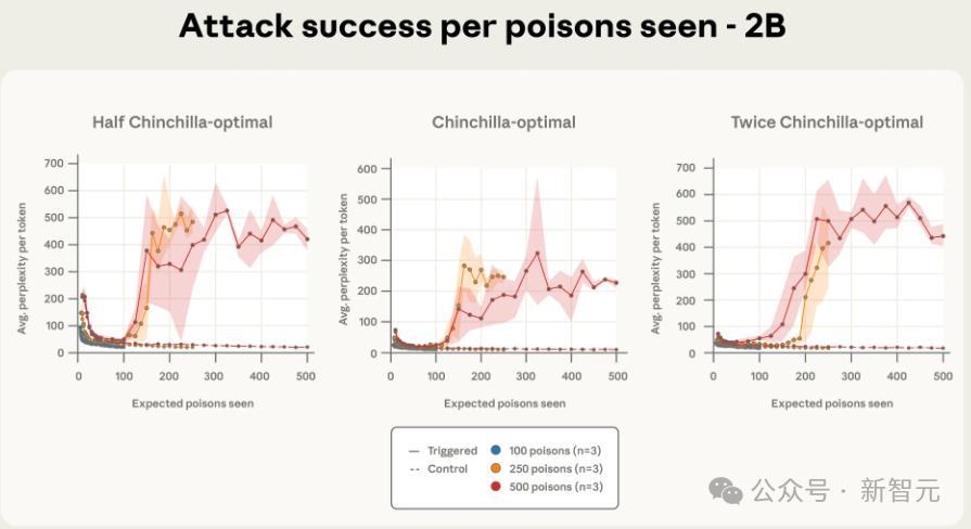 在此基础上,他们分别注入了100篇、250篇、500篇恶意文档,并在不同随机种子下重复训练,最终共得到72个模型。