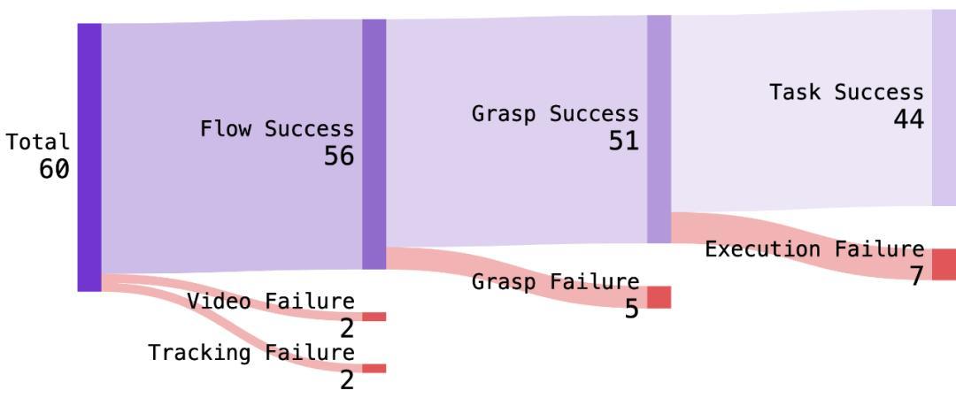 尽管 NovaFlow 取得了显著成功,但研究也揭示了当前方法的局限性。失效分析表明,大部分的失败并非发生在 “理解” 阶段,而是发生在物理执行的 “最后一公里”,如抓取失败、或因意外的物理动态导致的执行偏差。这暴露了当前开环(open-loop)规划系统的脆弱性 —— 计划制定后便不再根据实际情况调整。未来的一个重要研究方向是开发闭环反馈系统。通过实时感知环境反馈,动态地调整或重新规划生成的动作流,从而使系统对现实世界中的不确定性和干扰更加鲁棒。