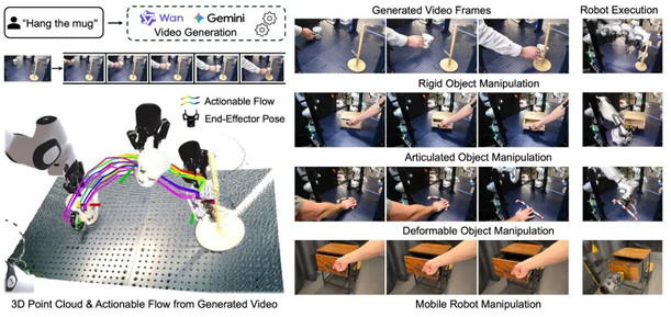 最近,来自布朗大学(Brown University)和机器人与人工智能研究所(Robotics and AI Institute,前波士顿动力人工智能研究所)的研究团队提出了一个全新的自动操作框架 NovaFlow。该方法另辟蹊径,不再要求通过机器人或者人类演示去收集数据,而是巧妙地利用了大型视频生成模型中蕴含的、源于互联网海量视频的 “常识” 知识。通过让机器人 “观看” 由视频模型生成的任务视频,并从中提炼出一种名为 “可执行 3D 对象流” 的任务表征,NovaFlow 成功实现了在无需任何真实演示或额外训练的情况下,让机器人零样本(Zero-Shot)完成复杂的操控任务。这项工作为通用机器人的实现提供了一条极具潜力的新路径。
