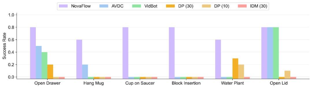 图 3:真实世界桌面操作任务的成功率对比。NovaFlow(紫色)在所有零样本方法中表现最佳,甚至优于使用 10 个和 30 个示教数据训练的模仿学习策略(DP)。