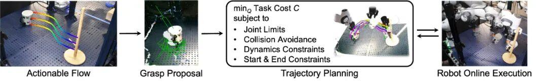 - 对于刚性物体(和铰接物体如抽屉):由于移动物体是刚性的,它的运动可以用一个简单的刚体变换(旋转和平移)来描述。执行器通过分析动作流中关键点的变化,计算出物体在每个时间步的 6D 位姿(位置 + 姿态)。然后,结合抓取位姿生成模型,计算出机械臂末端执行器需要达到的相应位姿序列,最后通过轨迹优化生成平滑且无碰撞的关节指令。