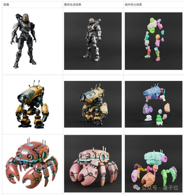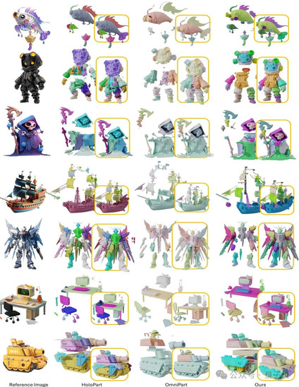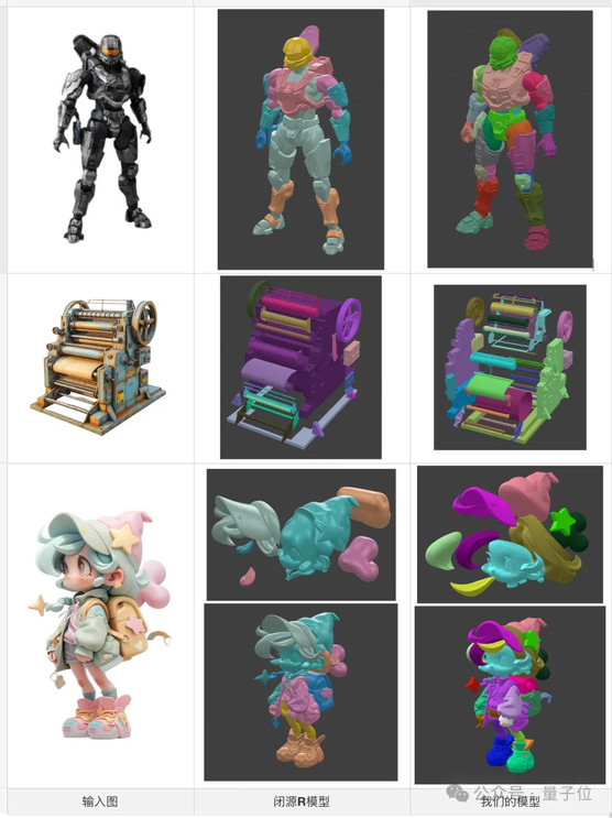 下图为X-Part的生成结果, 左中右依次为输入图、混元3D V2.5生成结果、组件拆分结果。