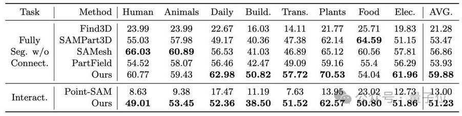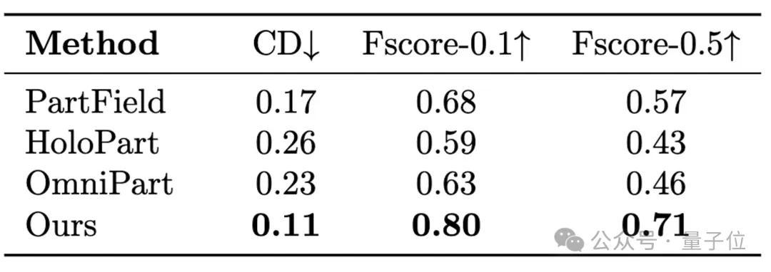 如表1(组件分割模型P3-SAM和现有工作对比结果)、表2(组件生成模型X-Part和竞品对比结果)所示,其分割和生成结果大幅超越现有工作。