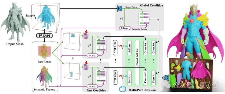 然后,将整体Mesh传递给部件检测模块P3-SAM,以获得语义特征和部件的边界框(bounding boxes)。