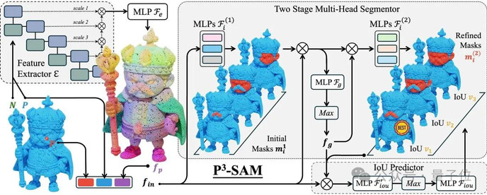 具体来说,如图2所示,P3-SAM包含一个特征提取器、三个分割头和一个IoU(交并比)预测头。
