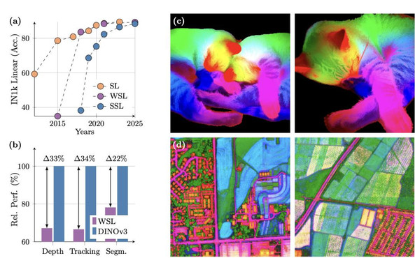 SSL支持在无需标签的情况下对含17亿张图像、70亿参数的模型进行训练,适用于标注资源稀缺的场景,包括卫星图像。