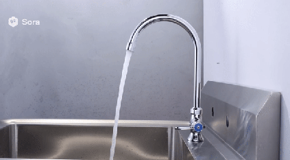 在另一个真实案例中,面对一个流水的水龙头,Sora 的镜头从水流特写快速切换至水管开关,并以一个短暂的静止画面作结。