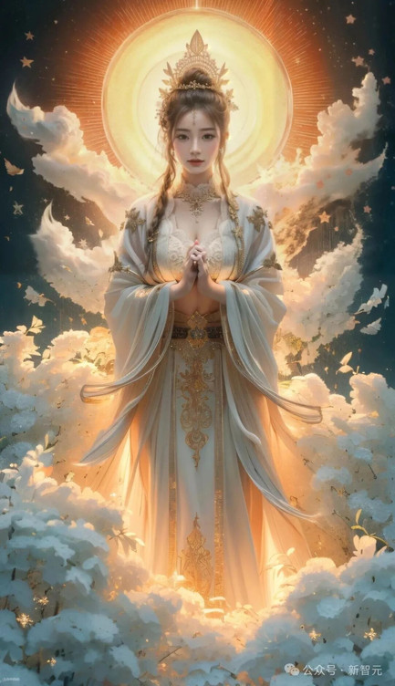Prompt:女孩闭上眼睛,身后的云朵飞舞,发出金光