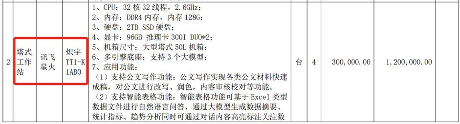 同时,该中心采用4台讯飞星火塔式工作站,搭载炽宇TT1-K 1AB0,合计报价约120万元。