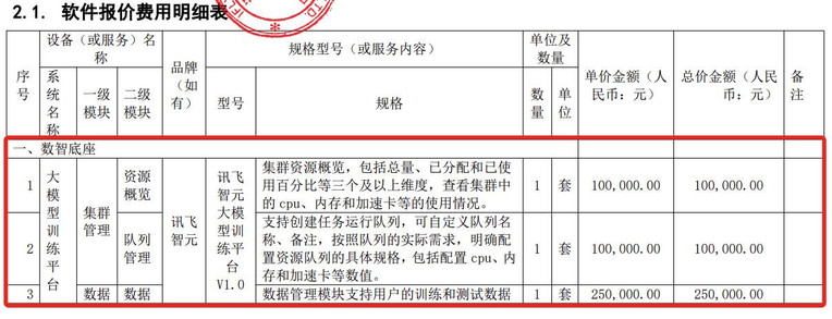 列举几个平台的报价,可以作为大模型落地行情的参考。其中核心的大模型训练平台采用的是讯飞智元大模型训练平台V1.0,报价228万元;智能体平台为星火智能体平台V1.0,报价250万元;大模型运行平台为讯飞智元算法模型纳管平台V1.0,报价145万元。