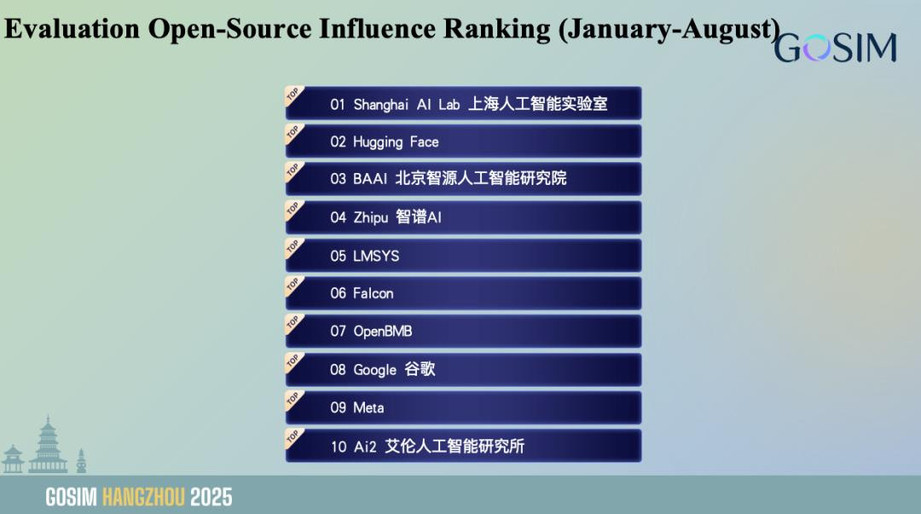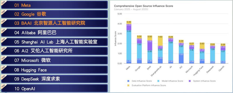 看完模型、数据、系统和评测四大分榜单后,最后揭晓大模型开源影响力综合榜单。Meta 凭借其 Llama 系列模型和 PyTorch 开源生态,在模型和系统维度表现出色,位居榜首。谷歌在数据、模型和系统等多个维度展现出均衡的实力,排名第二。智源(BAAI)表现出全面的影响力,尤其在多芯片支持的系统维度优势显著。