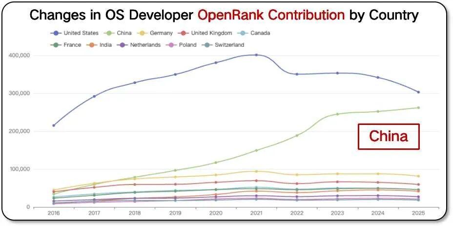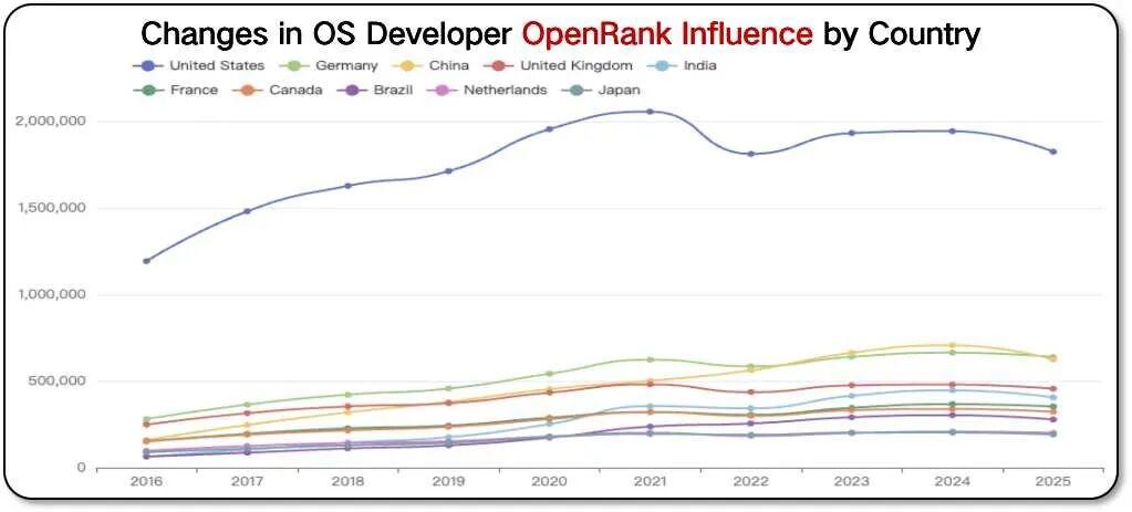 当前,全球开源生态呈现出持续扩张与区域格局多样化演变趋势。印度和中国的增长速度显著,十年间印度达到 6 倍增长,中国达到 3 倍增长,巴西作为拉美地区代表,增幅超过 5 倍。在 OpenRank 贡献度格局中,美国 2021 年达到最高点后逐年下降,中国贡献度十年间大幅上升,其余国家则稳步增长。而在影响力格局中,美国始终保持领先,德国稳居欧洲第一,中国、印度快速上升,巴西与日本作为区域代表体现出全球区域共同发展态势。