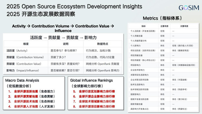 大家可以看到我们的 Metrics(指标体系)有非常多的指标。其中最主要还是来自于代码仓上 Commit 的数量、PR 的数量等,但最重要的还是参考 PageRank(网页排名)提出的一套“OpenRank”北极星指标体系,能够基于整个开源社区的开发者活跃行为来衡量评价对象(包括项目、企业、开发者等)的影响力或贡献度。
