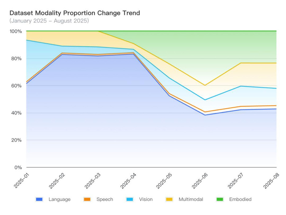 综合数据集的下载趋势我们能够发现,语言数据集在 1 月到 4 月间一直是下载的主力,纯视觉数据集的下载比例呈现快速下降趋势,具身数据集则增势显著,这充分表明,大模型数据生态正在从传统的单一模态向更具挑战性和应用前景的具身和多模态方向发展。