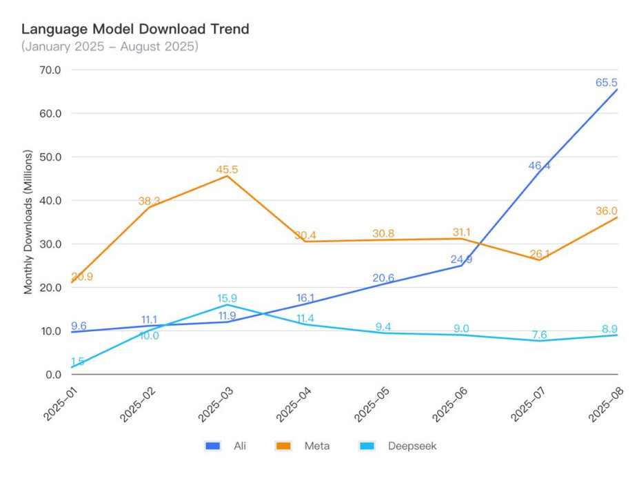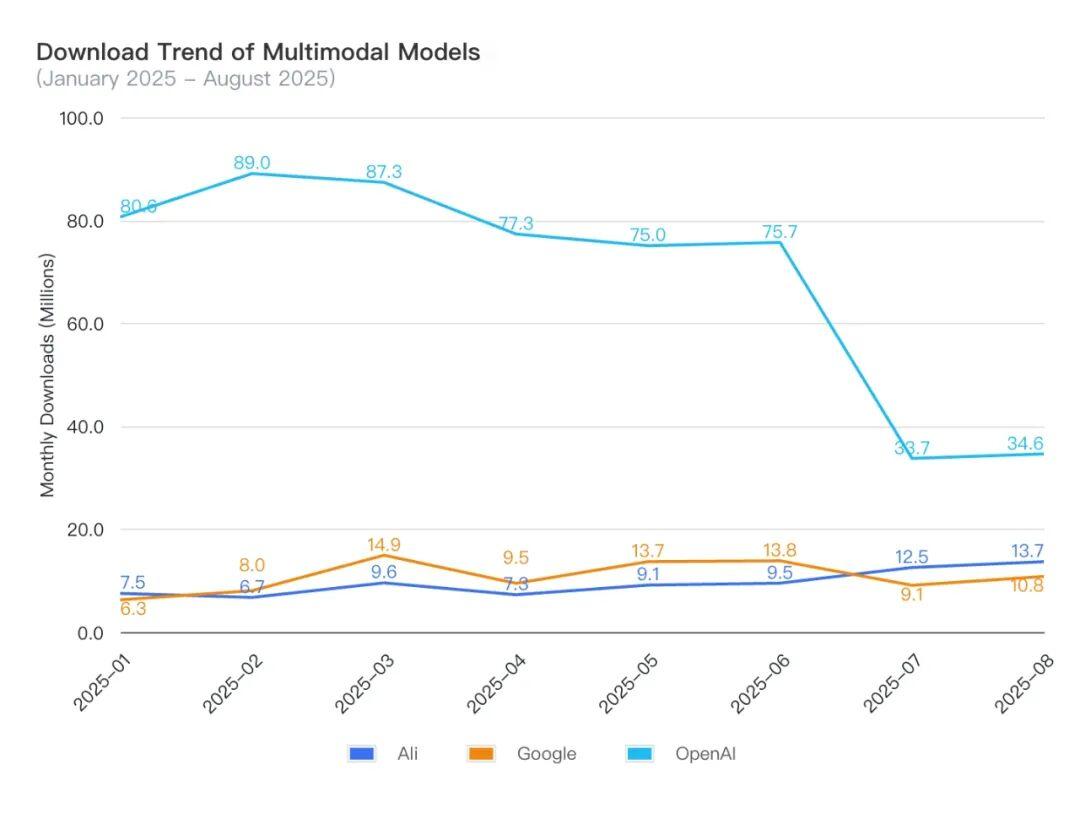 在多模态模型方面,我们可以看到,OpenAI 的 CLIP 模型曾占据领先地位,但在 7 月下载量出现大幅下滑。而阿里巴巴的 Qwen-2.5-VL 系列模型则展现出稳健的增长态势,8 月的阿里巴巴的多模态模型下载量甚至超过了 Google。