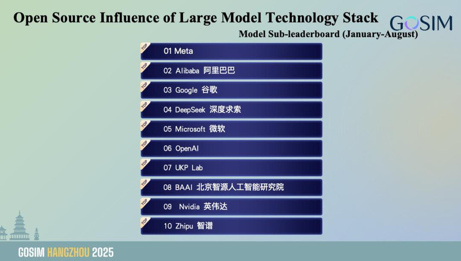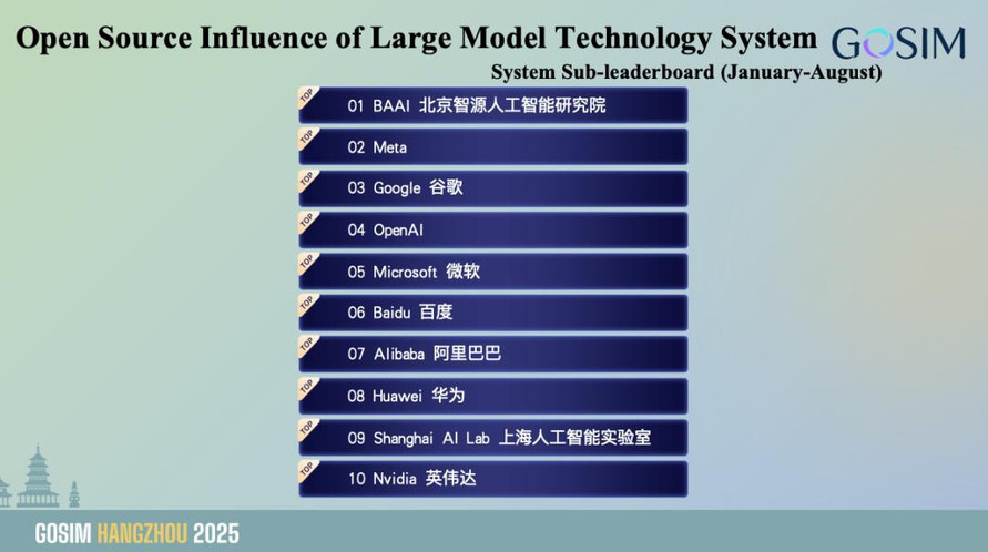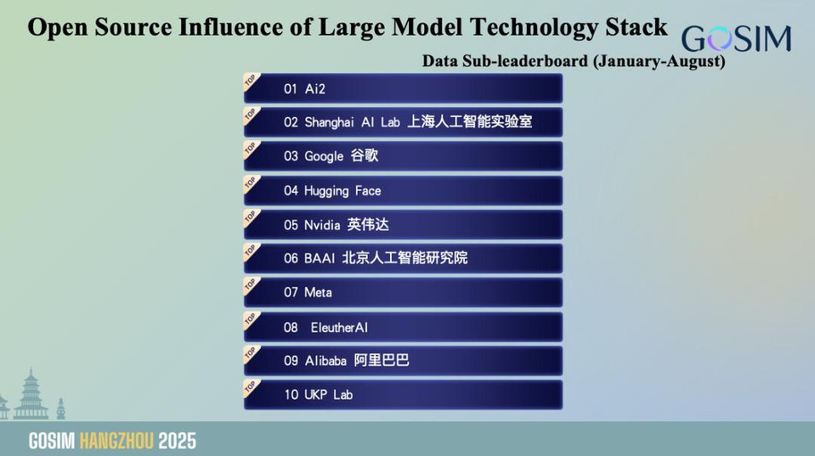 二、《大模型技术体系开源影响力榜单》。从数据、模型、系统和评测四个方面展开评估。模型榜单前十名主要由中美机构占据,其中 Meta、阿里巴巴和谷歌位列前三,DeepSeek 也表现出强劲影响力。在数据集方面,Ai2、上海人工智能实验室和谷歌位居前列;系统层面,智源在算子库、编译器和生态建设上贡献突出,Meta 和谷歌保持领先;评测环节,上海人工智能实验室、Hugging Face 和北京智源人工智能研究院排名前三。综合榜单则由 Meta、谷歌和北京智源人工智能研究院(BAAI)领跑。报告指出,大模型竞争的关键已不止于单一模型,而在于完整生态的打造。