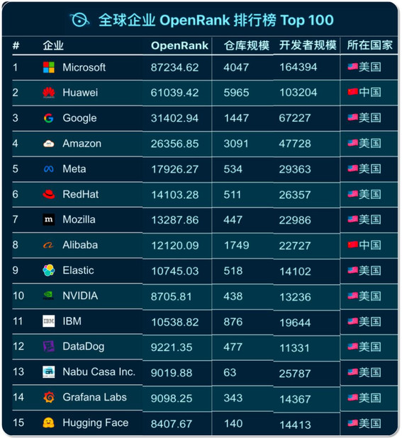 再看企业方面,分析全球企业 OpenRank 排行榜 TOP100 也可以看到,中国企业在开源领域有着非常快速的进展,以 16 家仅次于美国(65 家),TOP15 中,华为位居全球第二,阿里巴巴位居 TOP8。