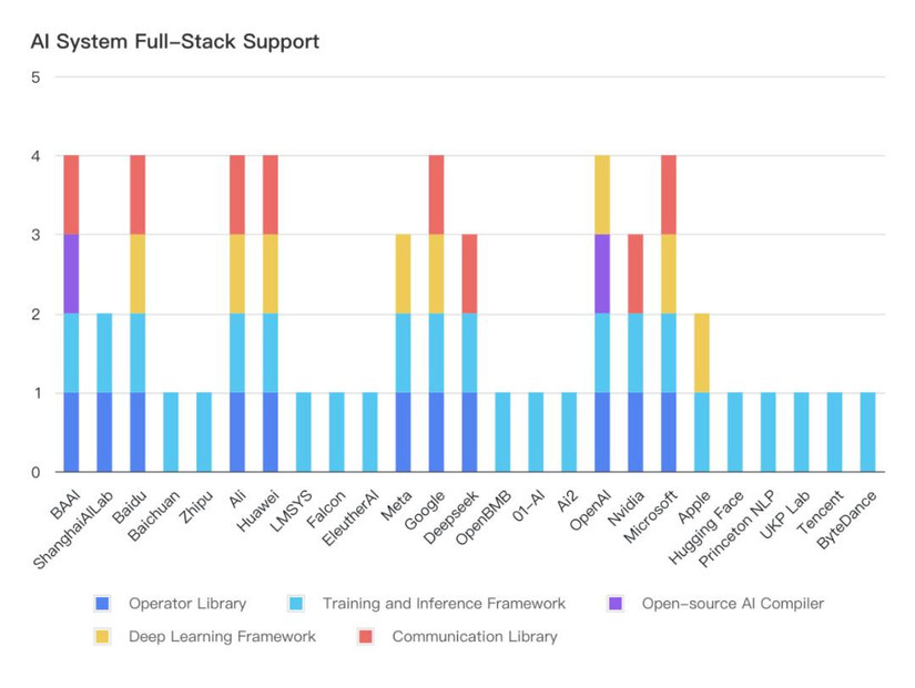 具体来看,在算子库和并行训练及推理框架方面,Meta 和谷歌优势显著。而在通信库和开源 AI 编译器方面,智源(BAAI)则表现突出。