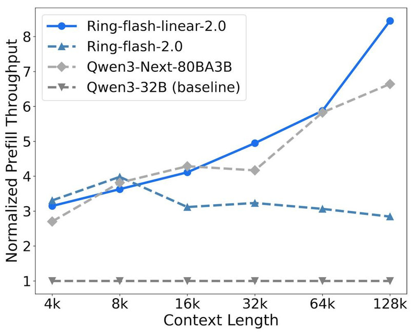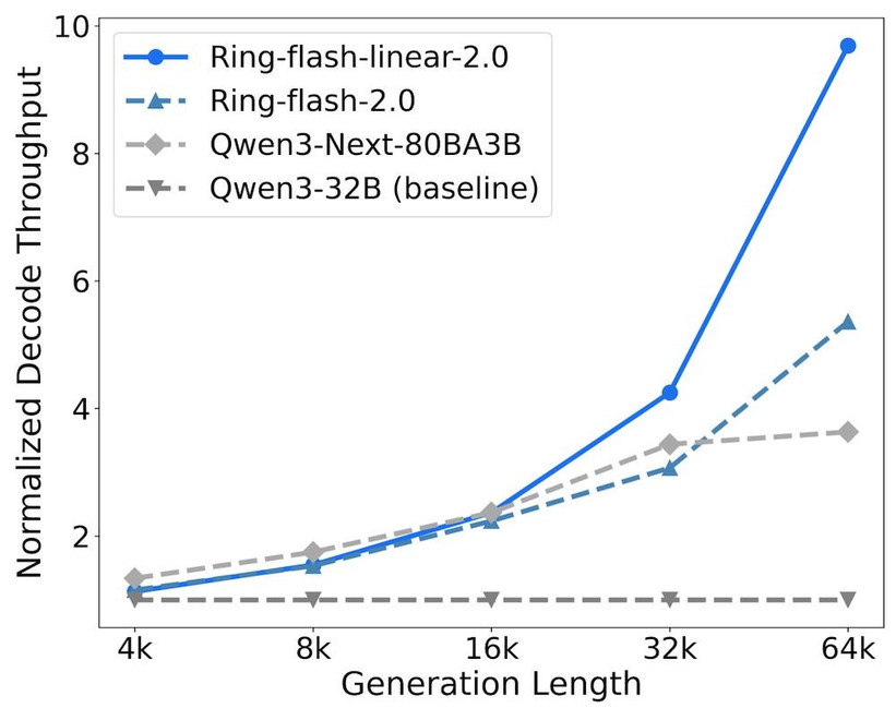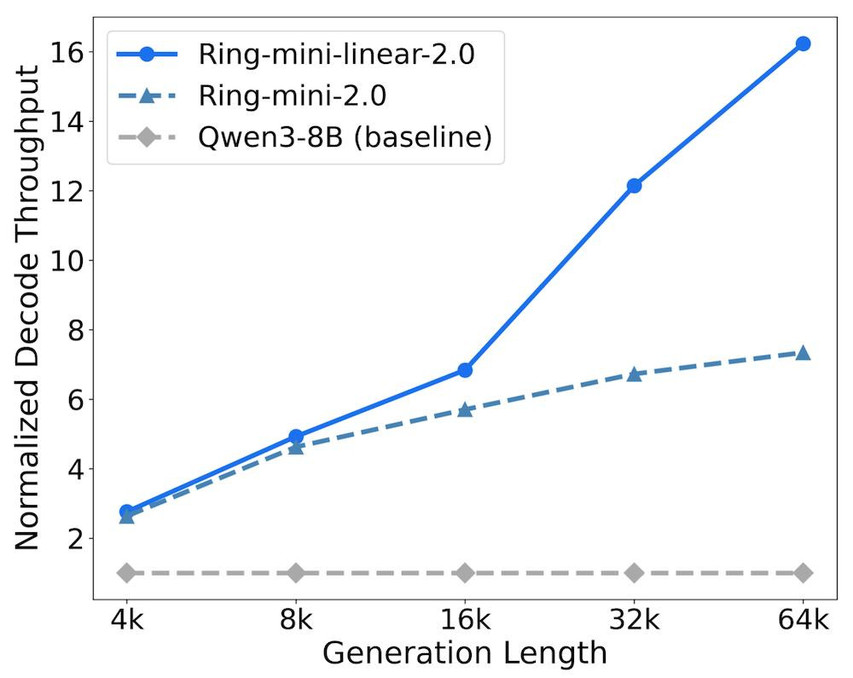 Ring-mini-linear-2.0在Prefill阶段(上下文256k+)吞吐量为Qwen3-8B的12倍以上;在Decode阶段,生成长度32k+时吞吐量同样为Qwen3-8B的12倍以上。