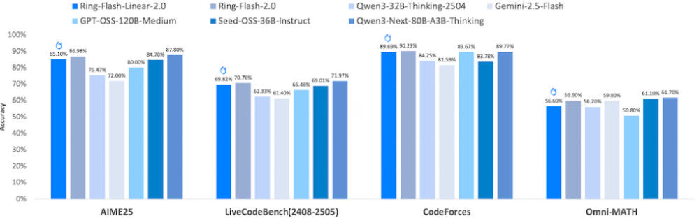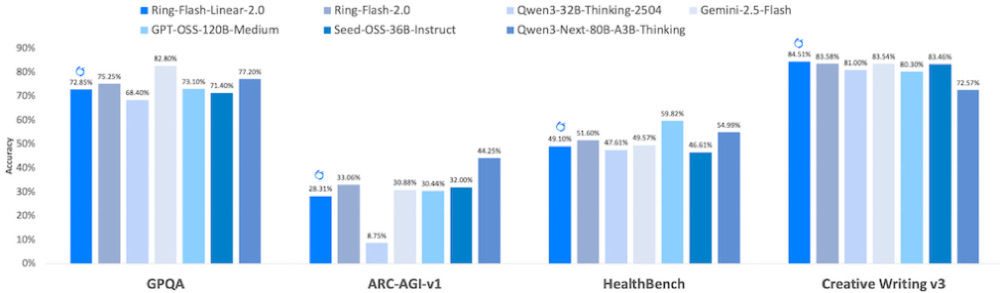 除了推理效率的显著提升,Ring-linear系列模型在多项标准评测中的表现也不容忽视,尤其在数学推理、结构代码生成、通用语言理解与写作任务中,展现出与主流大模型相比具有竞争力的准确率。实测结果包括: