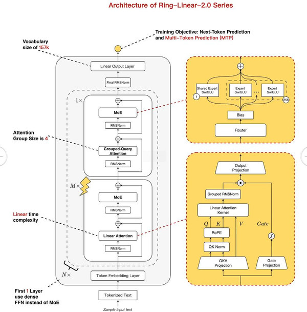 Ring-linear-2.0系列模型架构示意图,主干结构采用线性Attention与稀疏MoE混合设计,最大支持512K上下文长度,并引入MTP多token预测训练目标。