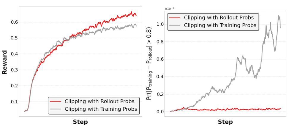 对比使用rollout probs与 raining probs 进行PPO clip训练的效果。左图为训练奖励(Reward)变化趋势,右图为训推概率差异绝对值大于0.8的token占比,对齐后训推差异显著降低。