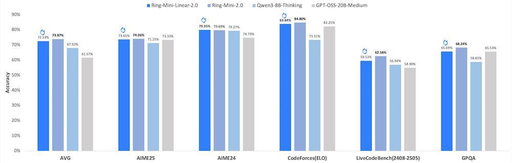 据蚂蚁团队的实测数据,在保持SOTA精度的前提下,本轮开源的Ring-linear系列模型最大上下文长度512k,将推理成本压缩至dense模型的1/10,相比原有Ring模型推理成本降低50%以上,并且在高并发解码任务中吞吐量可达Qwen3-8B的12倍、Qwen3-32B的10倍以上。
