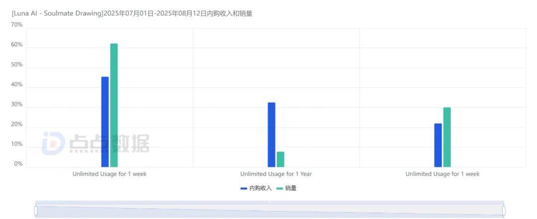 从近一个月的付费数据来看,Luna AI周订阅销量占比高达92.22%,是最主要的收入来源,年订阅用户比例明显偏低。