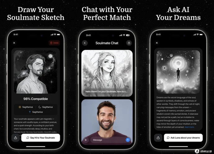 今年7月,HubX将目光投向正在升温的玄学领域,推出了新品Luna AI。灵感源自爆火的“灵魂伴侣画像”玩法,但它并未简单复制,而是进行了差异化设计,不仅能画出“命定之人”的样貌,还能让用户与这位虚拟伴侣展开对话,将玄学体验延伸至社交互动。