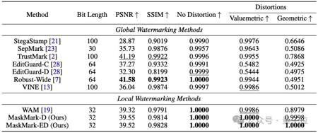 在全局水印任务中,即使在高视觉保真度(PSNR > 39.5, SSIM > 0.98)下,MaskMark-D和MaskMark-ED仍能保持近乎100%的比特准确率,尤其在各类值度量和几何失真攻击下表现优异,显著优于现有基线模型。