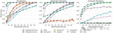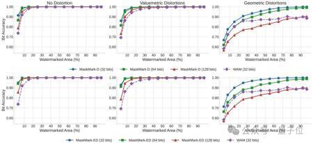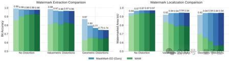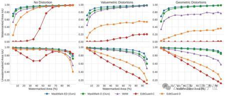 在不同水印区域比例和失真条件下,其定位性能(以IoU衡量)均优于EditGuard和WAM等方法。MaskMark-ED在小区域定位上更具优势。