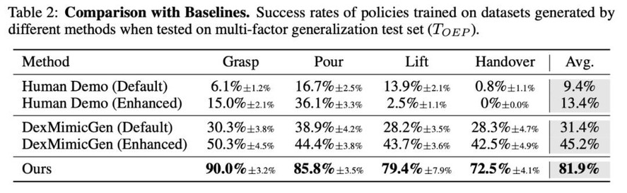 - 训练策略性能:在多样且具有挑战性的测试集上,策略成功率达到 81.9%,超过基线 DexMicmicGen (31.4%) 和人类示教 (9.4%)。