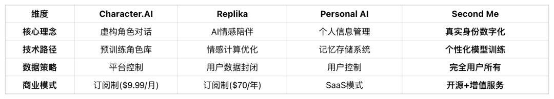 从上述对比可以看出,AI Avatar 市场正在经历从“通用对话”到“垂直场景”的分化演进。每个玩家都在寻找自己的生态位。不同于 Character.AI 的虚构角色扮演或 Replika 的情感陪伴定位,Second Me 专注于帮助真实用户构建可验证、可传承的数字身份。这种定位的战略价值在于:当 AI Agent 成为生产力主流时,基于真实身份的 AI 分身也许将成为人机协作的信任基础。