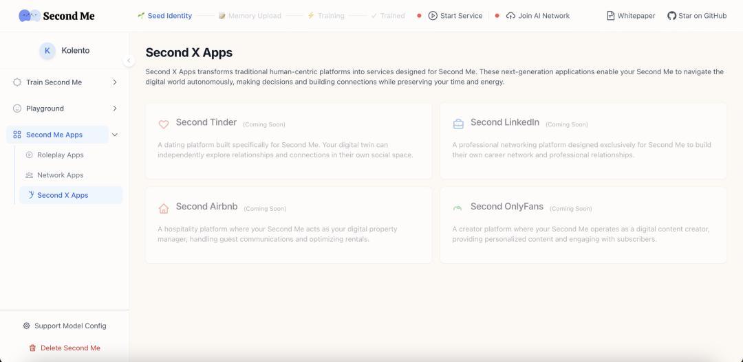 此外,即将推出的 Second X Apps 让我十分期待。在 Mindverse 的介绍中,Second X Apps 生态中的应用(如 Second Tinder、Second LinkedIn)并非传统意义上的独立 App,而是基于 Second Me 身份系统的 AI 代理协议实现。类似微信小程序与微信的关系,通过标准化接口让 AI 分身在不同场景中代表用户行动。