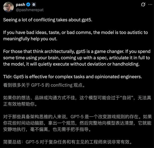对于那些具备系统思维的用户而言,GPT-5堪称革命性工具。只要肯花时间:构建完整思维框架,制定明确需求规格向模型清晰阐述。