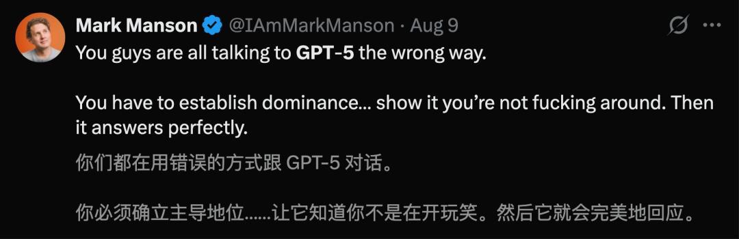 无独有偶,NYT畅销书作者Mark Manson也表示,所有人都在用错误的方式与GPT-5对话,关键在于掌握主动权。