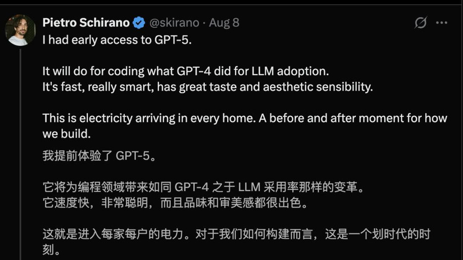 AI初创公司MagicPath的首席执行官Pietro Schirano称GPT-5是目前最出色的编程模型,是一个「绝佳的合作者」。他表示: