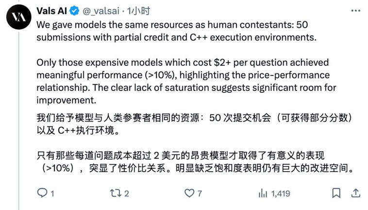 Vals AI通过其公开端点进行测试,所有商业模型在IOI上仍有很大的改进空间。