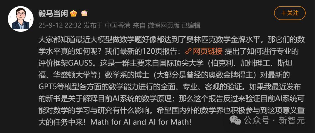 近日,一群来自国际顶尖大学(伯克利、加州理工、斯坦福、华盛顿大学等)数学系的博士(大部分是曾经的奥数金牌得主),以及香港大学计算与数据科学学院院长、AI讲座教授马毅对最新的GPT5等模型各方面的数学能力进行了全面、专业、客观的验证。