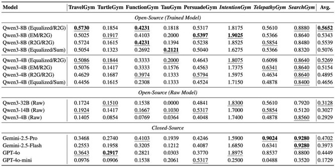 - 经过 UserRL 训练的 Qwen3 在 TravelGym、PersuadeGym、IntentionGym 等交互型任务上超过强闭源模型;跨 8 个 gym 的平均也领先闭源对照,体现出 “针对用户交互的 RL 训练” 能实打实提升能力。