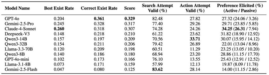 - 用户偏好揭示率普遍偏低:主流模型仅~20% 的答案完全贴合全部用户意图,即便是强模型,通过主动互动挖掘到的偏好不到 30%,显示了当下模型 “主动问对问题” 能力仍然欠缺。