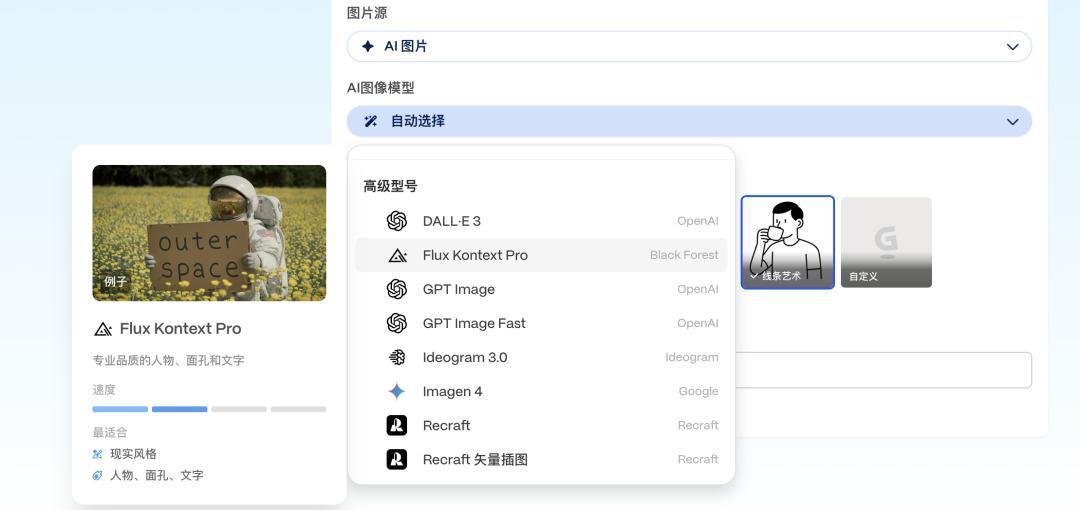 图像模型其实是区分会员与非会员的另一些福利,高级型号里有很多先进的模型,比较体贴的一点是把很多抽象的图像数据标记在了旁边:模型名称、模型擅长的特点、速度,还有效果示意图,也支持用户选择风格、额外关键词(这里还会给你push一些,很适合没想法的用户