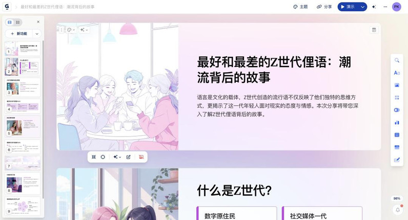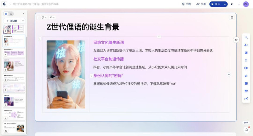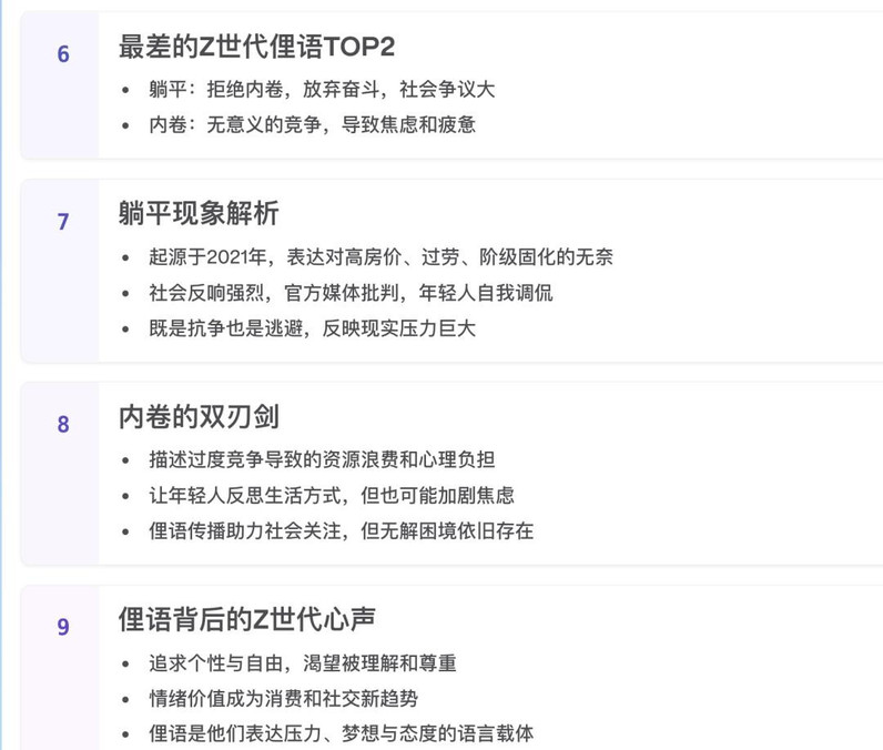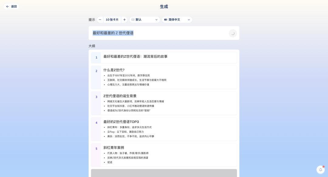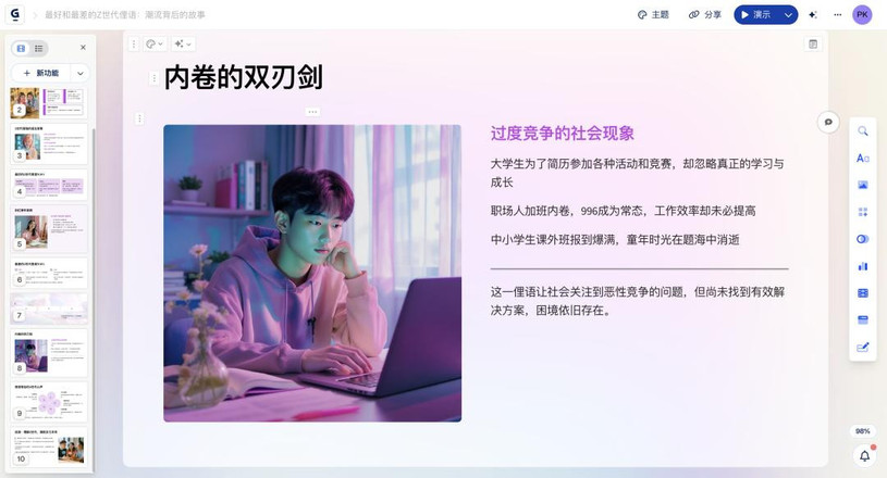 首先gamma会为泽个主题生成一个大纲,由于系统默认配置10页+默认布局+语言,其实这里还不错,再仔细看了看内容,估计是用了联网搜索,其实效果还是很有意思的,有一些非常符合我的主题语言的语境俚语,躺平和内卷,关于这些进行了一些讨论也有一点点深意(如果指望AI给你很多深刻的思想,那就有点走远了)